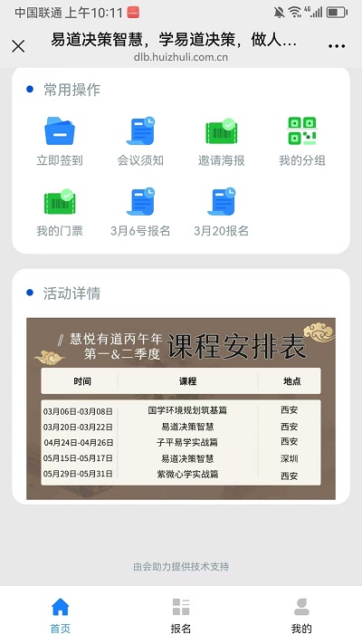 本次培训会议全程使用会助力智能会务系统,定制内容包括立即签到,会议须知,邀约海报,我的分组,我的门票,分组报名等内容。